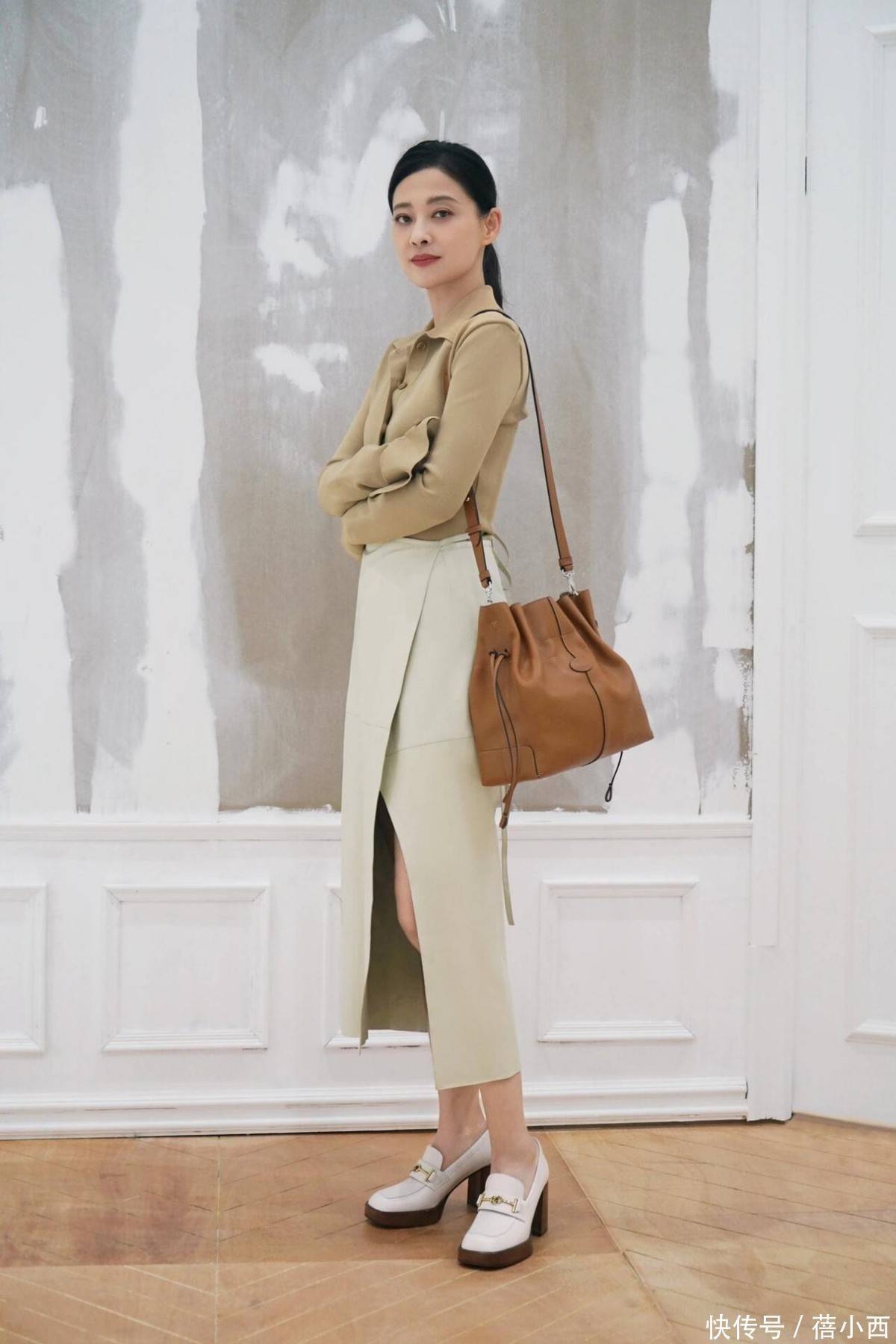 下身搭配米白色高开叉半裙,这种浅米白比纯白更柔和,不会和卡其色形成强烈对比,反而让整体色调更统一。半身裙的高腰设计也能够精准抬高腰线,把身材比例分割得恰到好处,裙长到小腿中部,刚好露出纤细脚踝,高开叉设计从大腿中部延伸,行走间若隐若现露出腿部线条,既灵动又不会显得轻浮,梨形身材的美眉们可以大胆尝试。
